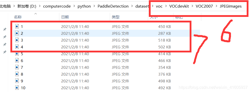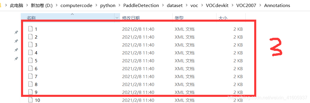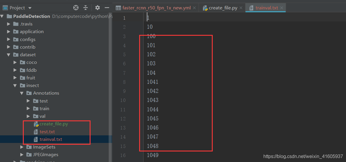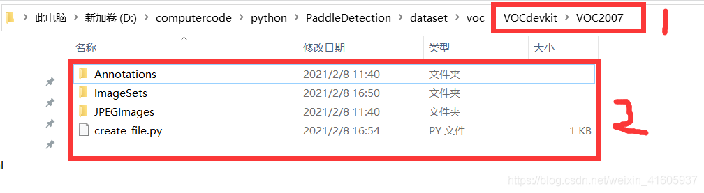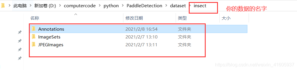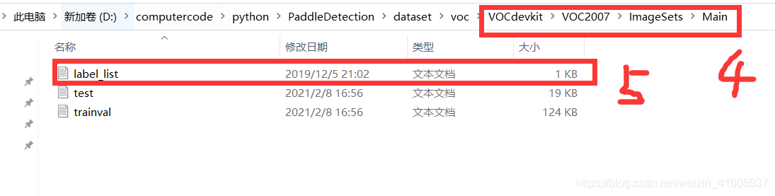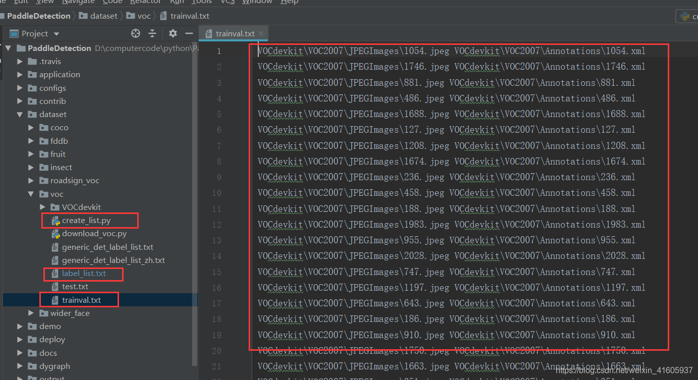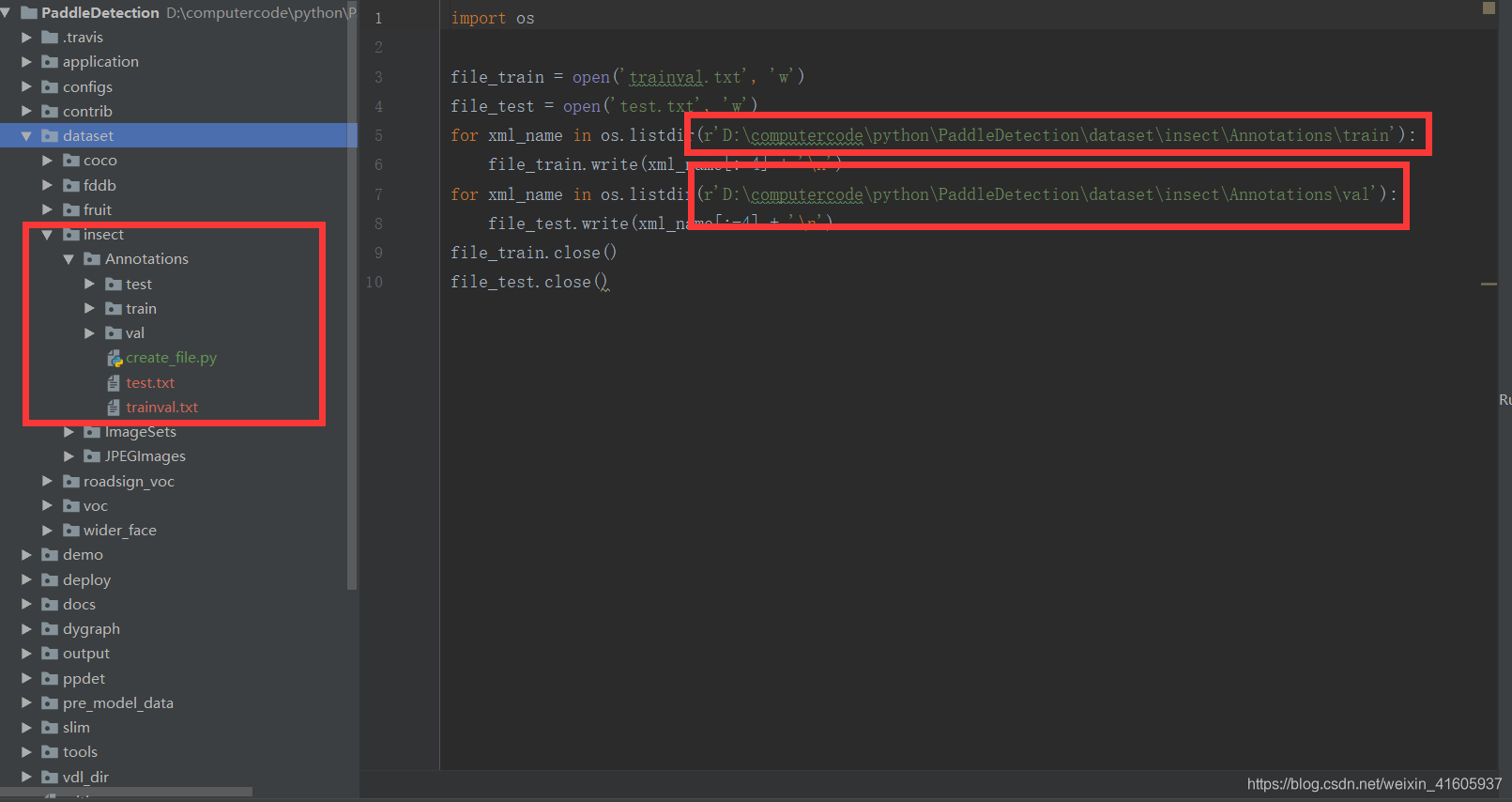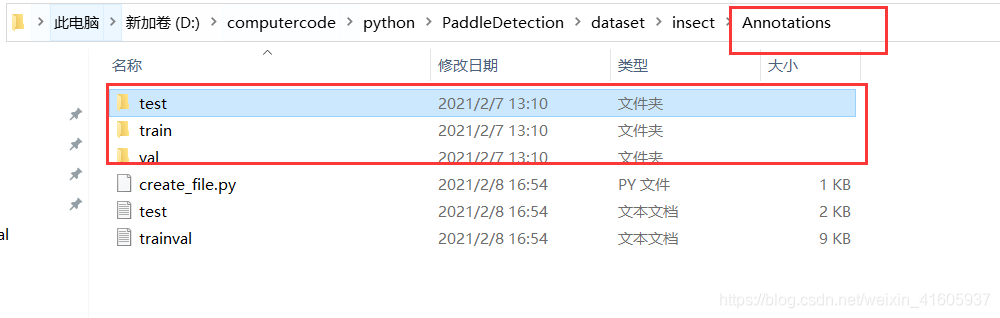 import osfile_train = open('trainval.txt', 'w')file_test = open('test.txt', 'w')for xml_name in ##这里的路径填写绝对路径os.listdir(r'D:\computercode\python\PaddleDetection\dataset\insect\Annotations\train'): file_train.write(xml_name[:-4] + '\n')for xml_name in os.listdir(r'D:\computercode\python\PaddleDetection\dataset\insect\Annotations\val'): file_test.write(xml_name[:-4] + '\n')file_train.close()file_test.close() VOC数据集所必须的文件内容如下所示,数据集根目录需有VOCdevkit/VOC2007或VOCdevkit/VOC2012文件夹,该文件夹中需有Annotations,JPEGImages和ImageSets/Main三个子目录,Annotations存放图片标注的xml文件,JPEGImages存放数据集图片,ImageSets/Main存放训练trainval.txt和测试test.txt列表。